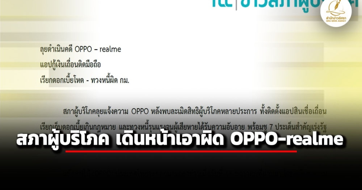 สภาผู้บริโภคลุยฟ้องคดี และแจ้งความดำเนินดคีกับ OPPO – realme หลังพบละเมิดสิทธิผู้บริโภคหลายประการ ทั้งติดตั้งแอปสินเชื่อเถื่อน เรียกเก็บดอกเบี้ยเกินกฎหมาย และทวงหนี้รุนแรงจนผู้เสียหายได้รับความอับอาย พร้อมชู 7 ประเด็นสำคัญเร่งรัฐดำเนินคดี