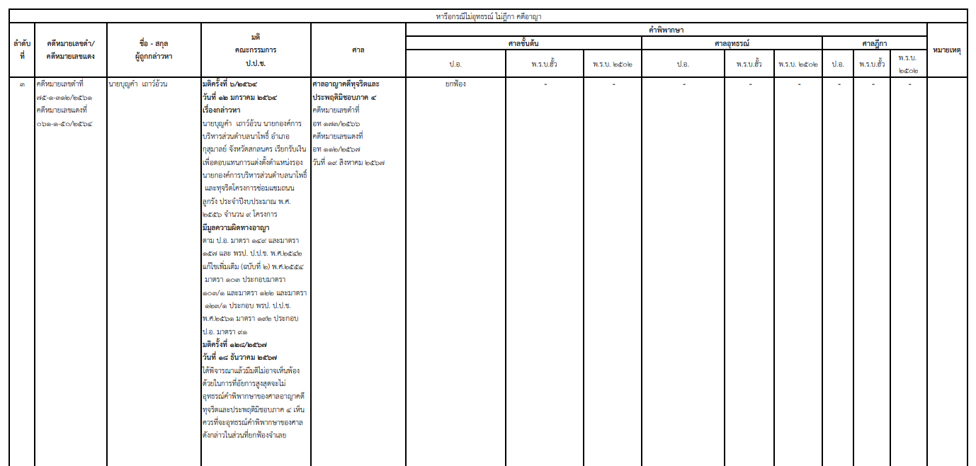เผยแพร่ความคืบหน้าผลคดี 'บุญคำ เถาว์อ้วน' อดีตนายก อบต.นาโพธิ์ สกลนคร เรียกรับเงินตอบแทนแต่งตั้งรองนายกฯ -ทุจริตซ่อมแซมถนนลูกรัง 9 โครงการ ล่าสุด ศาลอาญาคดีทุจริตประพฤติมิชอบภาค 4 พิพากษายกฟ้อง - ป.ป.ช.ค้าน อสส. ขออุทธรณ์สู้