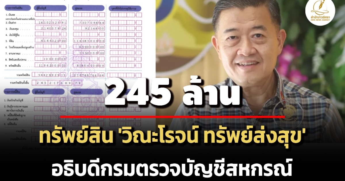 ป.ป.ช. เปิดทรัพย์สิน 'วิณะโรจน์ ทรัพย์ส่งสุข' อธิบดีกรมตรวจบัญชีสหกรณ์ ทรัพย์สิน 245 ล. รายได้ 2.9 ล./ปี