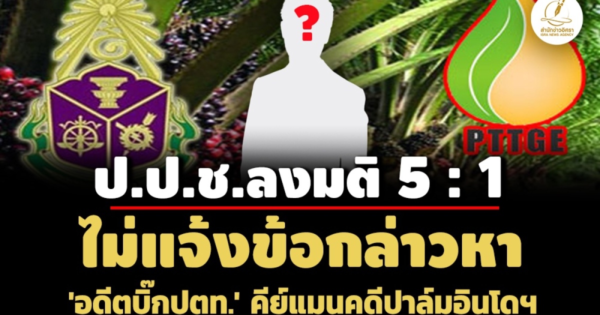ป.ป.ช.ลงมติ 5 ต่อ 1 ไม่แจ้งข้อกล่าวหา 'อดีตบิ๊กปตท.' คีย์แมนคดีปาล์มอินโดฯ เหตุหลักฐานไม่เพียงพอ เผย'เอกวิทย์ วัชชวัลคุ' ข้างน้อย ส่วนผู้ถูกกล่าวหารายอื่นอยู่ระหว่างสรุปคำชี้แจงแก้ข้อกล่าวหาสรุปสำนวนไต่สวนเป็นทางการ