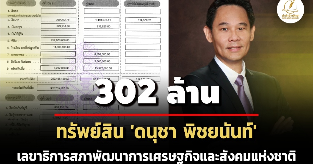 ป.ป.ช.เปิดทรัพย์สินผู้ดำรงตำแหน่งระดับสูง 'ดนุชา พิชยนันท์' เลขาธิการสภาพัฒนาการเศรษฐกิจและสังคมแห่งชาติ ทรัพย์สิน 302 ล. ที่ดิน 5 แปลง 252 ล. รายได้ 9.3 ล./ปี
