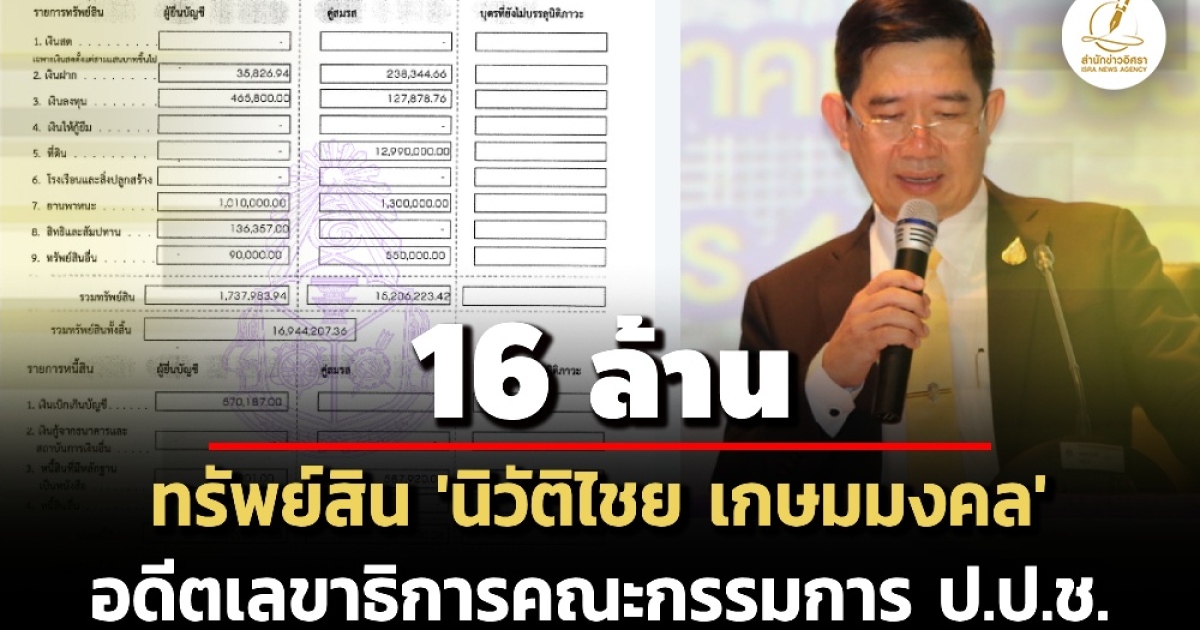 สำนักข่าวอิศรา (www.isranews.org) รายงานว่า เมื่อวันที่ 24 ม.ค. 2568 สำนักงานคณะกรรมการการป้องกันและปราบการทุจริตแห่งชาติ (ป.ป.ช.) เปิดเผยบัญชีแสดงรายการทรัพย์สินและหนี้สินผู้ดำรงตำแหน่งระดับสูง ราย นายนิวัติไชย เกษมมงคล เลขาธิการคณะกรรมการ ป.ป.ช. กรณีพ้นจากการเป็นเจ้าหน้าที่ของรัฐ เมื่อวันที่ 1 ต.ค. 2567