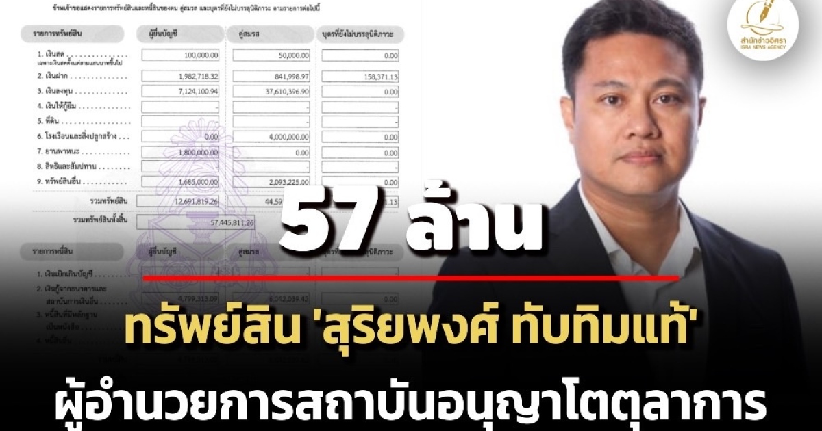 ป.ป.ช. เปิดทรัพย์สิน 'สุริยพงศ์ ทับทิมแท้' ผู้อำนวยการสถาบันอนุญาโตตุลาการ ทรัพย์สิน 57 ล. รายได้ 2.7 ล./ปี
