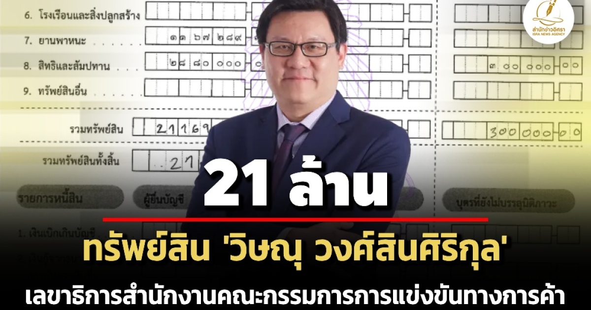 สำนักข่าวอิศรา (www.isranews.org) รายงานว่า เมื่อเร็ว ๆ นี้ สำนักงานคณะกรรมการการป้องกันและปราบการทุจริตแห่งชาติ (ป.ป.ช.) เปิดเผยบัญชีแสดงรายการทรัพย์สินและหนี้สินผู้ดำรงตำแหน่งระดับสูง ราย นายวิษณุ วงศ์สินศิริกุล เลขาธิการสำนักงานคณะกรรมการการแข่งขันทางการค้า (กขค.) กรณีเข้ารับตำแหน่ง เมื่อวันที่ 30 ก.ย. 2567