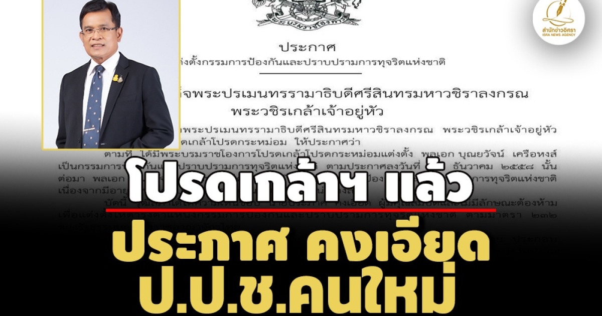 จึงทรงพระกรุณาโปรดเกล้าโปรดกระหม่อมแต่งตั้ง นายประภาศ คงเอียด เป็นกรรมการป้องกันและปราบปรามการทุจริตแห่งชาติ