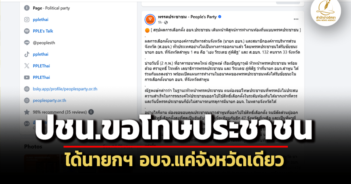 สำนักข่าวอิศรา (www.isranews.org) รายงานว่าเมื่อช่วงเย็นวันที่ 2 ก.พ. เฟซบุ๊กพรรคประชาชนได้โพสต์ข้อความกรณีที่นายวีระเดช ภู่พิสิฐ ได้รับเลือกตั้งเป็นนายกองค์การบริหารส่วนจังหวัด (อบจ.) ลำพูน และพรรคประชาชนได้รับการเลือกตั้งสมาชิก อบจ.จำนวน 132 คน จาก 33 จังหวัดทั่วประเทศ พร้อมกับตั้งข้อสังเกตุความไม่โปร่งใสการเลือกตั้ง นายก อบจ.ที่สมุทรปราการและเชียงใหม่ เนื้อหาระบุว่า