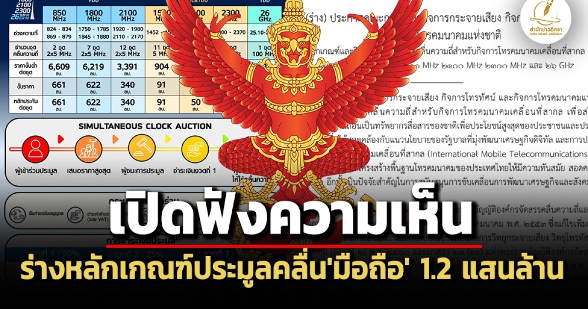 สำนักข่าวอิศรา (www.isranews.org) รายงานว่า ในวันที่ 6 ก.พ.นี้ สำนักงานคณะกรรมการกิจการกระจายเสียง กิจการโทรทัศน์และกิจการโทรคมนาคม (สำนักงาน กสทช.) จะมีการเปิดเวทีรับฟังความคิดเห็นสาธารณะ ร่างประกาศ กสทช. เรื่อง หลักเกณฑ์และวิธีการอนุญาตให้ใช้คลื่นความถี่สำหรับกิจการโทรคมนาคมเคลื่อนที่สากล ย่าน 850 MHz 1500 MHz 1800 MHz 2100 MHz 2300 MHz และ 26 GHz