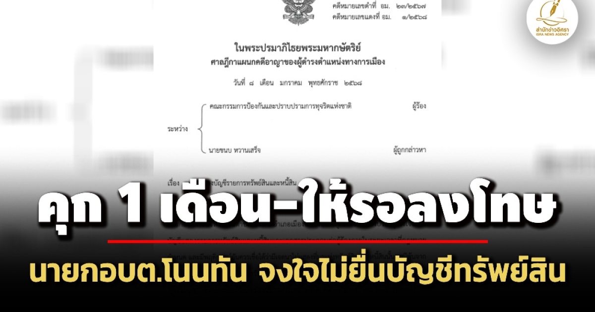รองนายก อบต.หนองบัวใต้ หนองบัวลำภู ไม่ยื่นบัญชีฯ 2 ครั้ง จําคุก 2 เดือน ให้รอลงโทษ