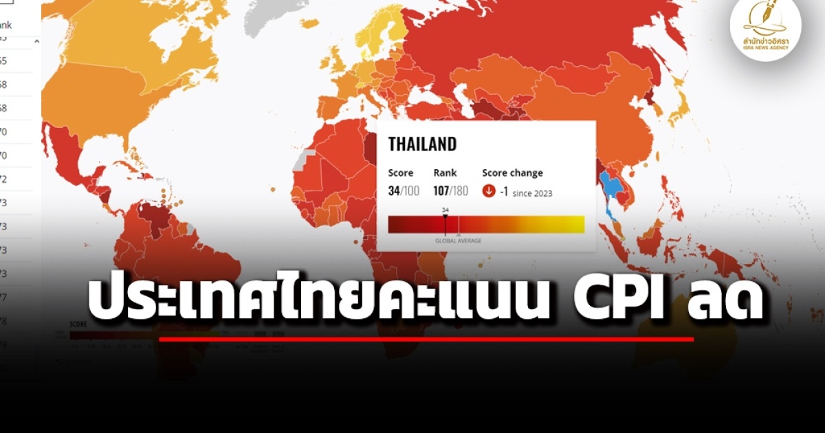 สำนักข่าวอิศรา (www.isranews.org) รายงานว่า เมื่อวันที่ 11 ก.พ.2568 เวลา 12.01 น. ตามเวลาในประเทศไทย องค์กรเพื่อความโปร่งใสนานาชาติ (Transparency International หรือ TI) ได้เผยแพร่ผลการสำรวจดัชนีการรับรู้การทุจริต (Corruption Perceptions Index หรือ CPI) ประจำปี 2567 โดยจากจำนวนประเทศ 180 ประเทศทั่วโลกนั้น ประเทศไทย ได้ 34 คะแนน คะแนนตกลงจากเมื่อปีที่แล้วที่ได้ 35 คะแนน จัดอยู่ในอันดับที่ 107 ของโลก ซึ่งอันดับดีขึ้นจากปีก่อนหน้าที่ได้อันดับ 108 ส่วนในอาเซียนพบว่าไทยอยู่ในอันดับที่ 5 รองจากสิงคโปร์,มาเลเซีย,เวียดนามและอินโดนีเซีย