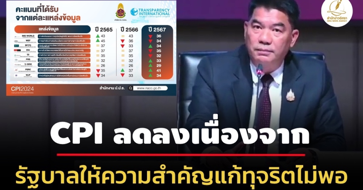 สำนักข่าวอิศรา (www.isranews.org) รายงานว่า เมื่อวันที่ 11 ก.พ. 2568 ที่สำนักงานคณะกรรมการการป้องกันและปราบการทุจริตแห่งชาติ (ป.ป.ช.) เวลา 14.30 น. นายศรชัย ชูวิเชียร รองเลขาธิการคณะกรรมการ ป.ป.ช. ภาค 6 รักษาราชการแทน รองเลขาธิการคณะกรรมการ ป.ป.ช. ในฐานะรองโฆษกสำนักงาน ป.ป.ช. แถลงข่าว โดยมีสาระเพิ่มเติมว่า ผลการสำรวจดัชนีการรับรู้การทุจริตของประเทศไทยในปี พ.ศ. 2567 นั้น เป็นการประเมินจากแหล่งข้อมูล 9 แหล่ง โดยประเทศไทยได้คะแนนเพิ่มขึ้น 5 แหล่ง ลดลง 4 แหล่ง ดังนี้