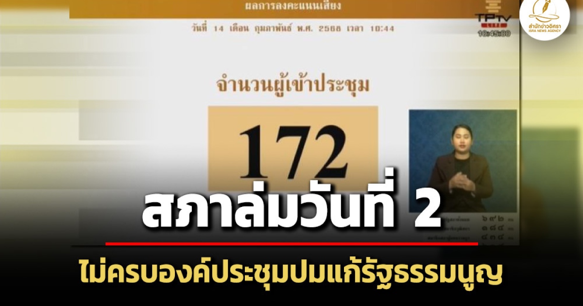 สภาล่มเป็นวันที่ 2 แสดงตัว 176 คน ไม่ครบองค์ประชุมก่อนถก ร่างแก้ไขเพิ่มเติมรัฐธรรมนูญ