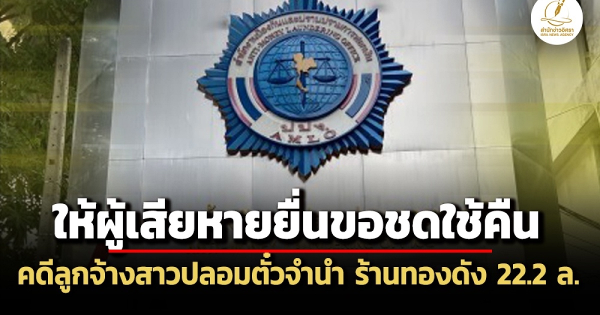 แพร่ประกาศสำนักงาน ปปง.ให้ผู้เสียหายยื่นคำร้องเพื่อขอรับคืนทรัพย์คดี ‘จุฬาลักษณ์ สืบแสง’ ลูกจ้างสาว กับพวก ลูกจ้างลักทรัพย์นายจ้าง ปลอมตั๋วจำนำ บ.ร้านทองดัง 217 ครั้ง เสียหาย 22.2 ล้าน