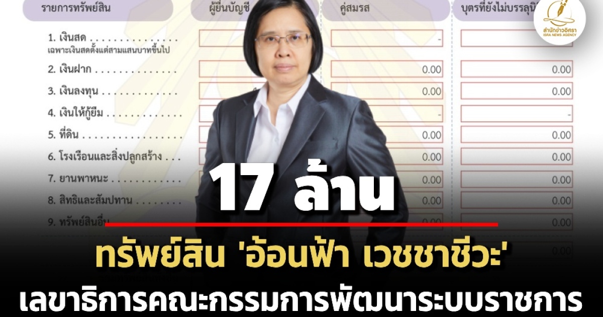 ป.ป.ช. เปิดทรัพย์สินผู้ดำรงตำแหน่งรดับสูง 'อ้อนฟ้า เวชชาชีวะ' เลขาธิการคณะกรรมการพัฒนาระบบราชการ ทรัพย์สิน 17 ล. รายได้ 2.1 ล./ปี