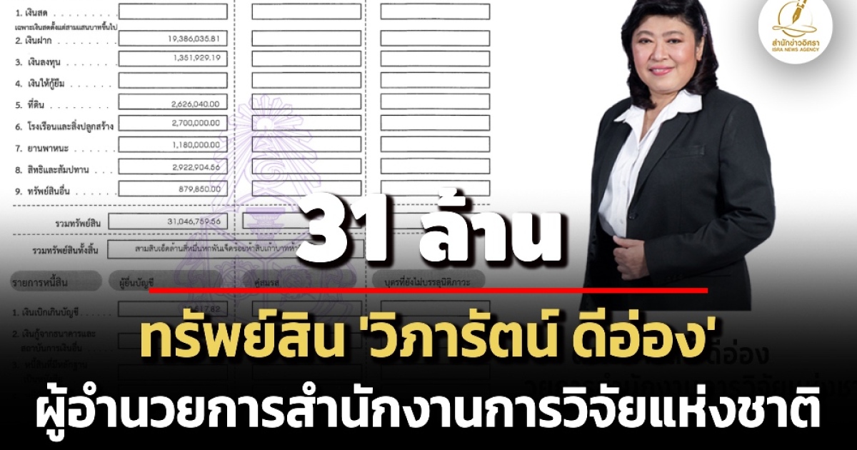 สำนักข่าวอิศรา (www.isranews.org) รายงานว่า เมื่อเร็ว ๆ นี้ สำนักงานคณะกรรมการการป้องกันและปราบการทุจริตแห่งชาติ (ป.ป.ช.) เปิดเผยบัญชีแสดงรายการทรัพย์สินและหนี้สินผู้ดำรงตำแหน่งระดับสูง ราย นางสาววิภารัตน์ ดีอ่อง ผู้อำนวยการสำนักงานการวิจัยแห่งชาติ กรณีทุกสามปีตลอดเวลาที่ยังดำรงตำแหน่งเจ้าหน้าที่ของรัฐ เมื่อวันที่ 2 ธ.ค. 2567