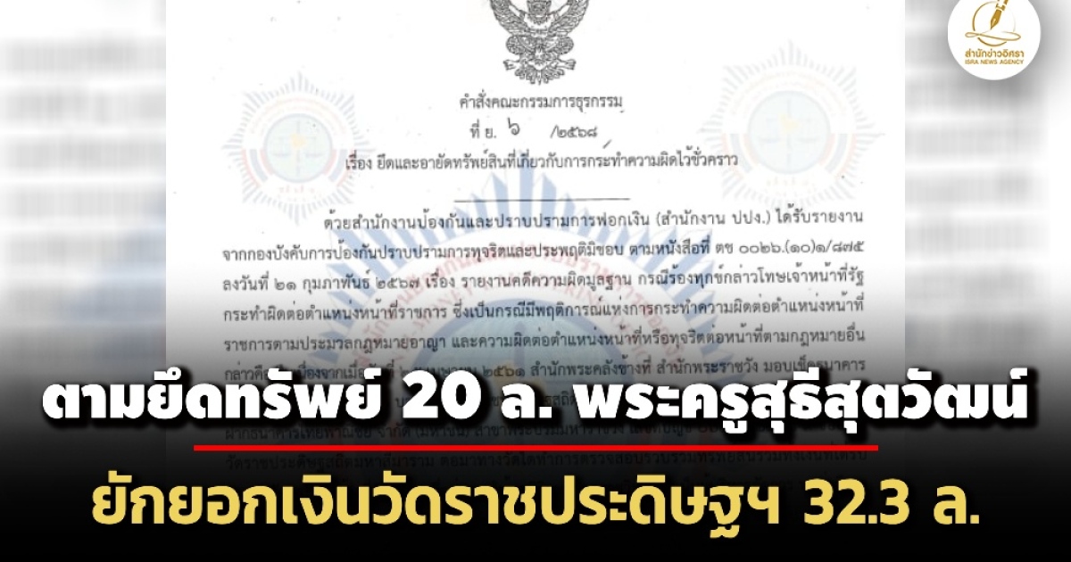ปปง.สั่งยึดอายัดทรัพย์ พระครูสุธีสุตวัฒน์ (วิวัฒน์ พ่วงเกิด) ผู้ช่วยเจ้าอาวาสวัดราชประดิษฐฯ กับพวก 20.1 ล. คดียักยอกเงิน 32.3 ล้าน หลังศาลอาญาคดีทุจริตพิพากษาจำคุก 45 ปี 6 เดือน-21 ปี ร่วมกันชดใช้เงินผู้เสียหาย