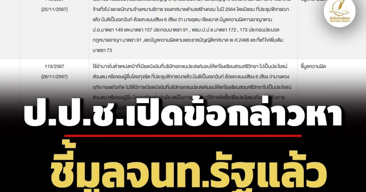 จากกรณีเมื่อวันที่ 23 ก.พ. 2568 สำนักข่าวอิศรา (www.isranews.org) นำเสนอข่าวสำนักงานคณะกรรมการป้องกันและปราบปรามการทุจริตแห่งชาติ (ป.ป.ช.) ได้เผยแพร่มติคณะกรรมการ ป.ป.ช. ตีตกข้อกล่าวหาและชี้มูลความผิดข้าราชการ เจ้าหน้าที่รัฐหลายคดีแต่ไม่มีการเปิดเผยรายละเอียดข้อกล่าวหาให้สาธารณชนได้รับทราบแต่อย่างใด