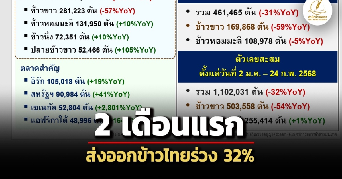 ทั้งนี้ ในช่วงตั้งแต่วันที่ 2 ม.ค.-24 ก.พ.2568 ไทยมีการส่งออกข้าวสะสม 1,102,031 ตัน ลดลง 32% เมื่อเทียบกับช่วงเดียวกันของปีก่อน แบ่งเป็นการส่งออกข้าวขาว 503,558 ตัน ลดลง 54% เมื่อเทียบกับช่วงเดียวกันของปีก่อน และการส่งออกข้าวหอมมะลิ 255,414 ตัน เพิ่มขึ้น 1% เมื่อเทียบกับช่วงเดียวกันของปีก่อน