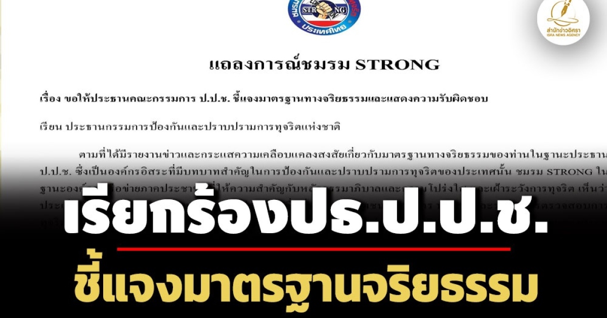 ชมรม STRONG ต้านทุจริตประเทศไทย ออกแถลงการณ์เรียกร้องประธาน ป.ป.ช.ขอให้ชี้แจงมาตรฐานทางจริยธรรมต่อสาธารณชน หลังปรากฏข่าวกระแสความเคลือบแคลงสงสัย หวั่นกระทบความเชื่อมั่นประชาชนต่อองค์กร ระบบการตรวจสอบทุจริตโดยรวมประเทศ นำไปสู่การเสื่อมถอยความไว้วางใจกลไกสำคัญรักษาความยุติธรรมสังคม