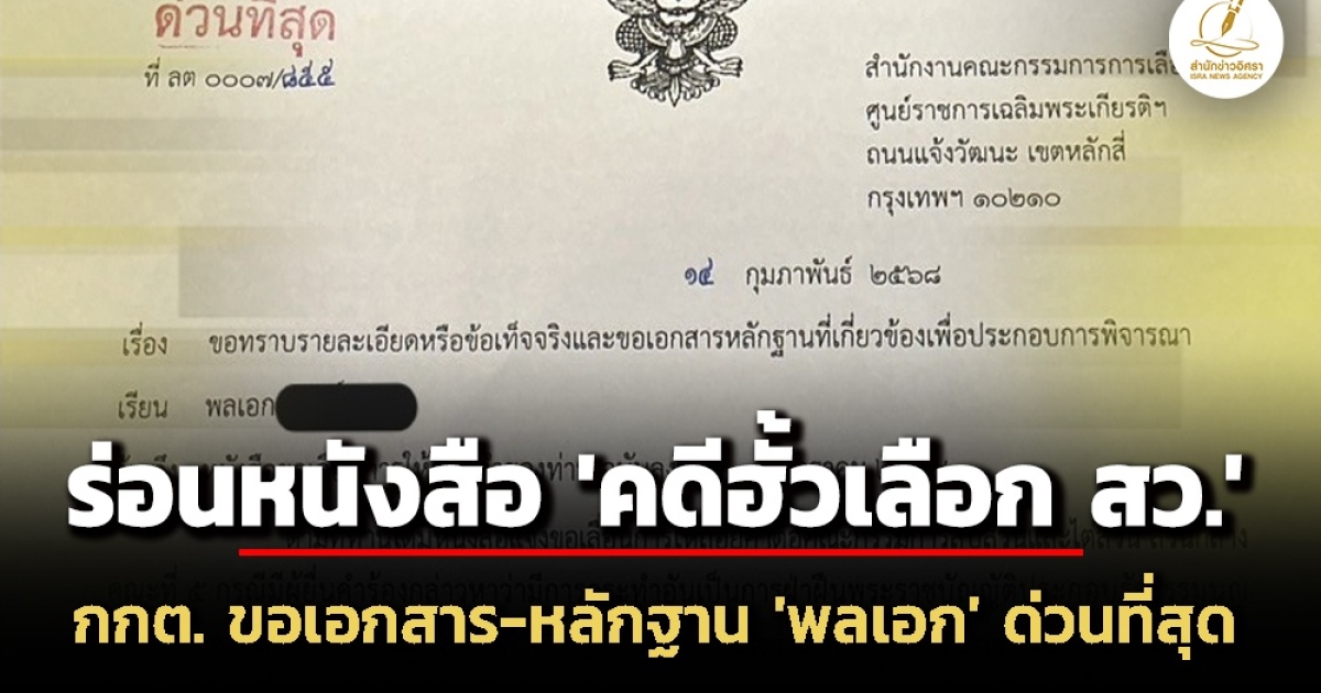 ประธานกรรมการสืบสวนและไต่สวน คณะที่ 5 สำนักงานคณะกรรมการการเลือกตั้ง ลงนามหนังสือ ด่วนที่สุด ถึง ‘สว.ยศพลเอก’ ขอให้ชี้แจง ข้อเท็จจริง-ขอเอกสารหลักฐาน คดีฮั้วเลือก สว. 7 ประเด็น หลังขอเลื่อนให้ถ้อยคำไป 11 เมษายน 68