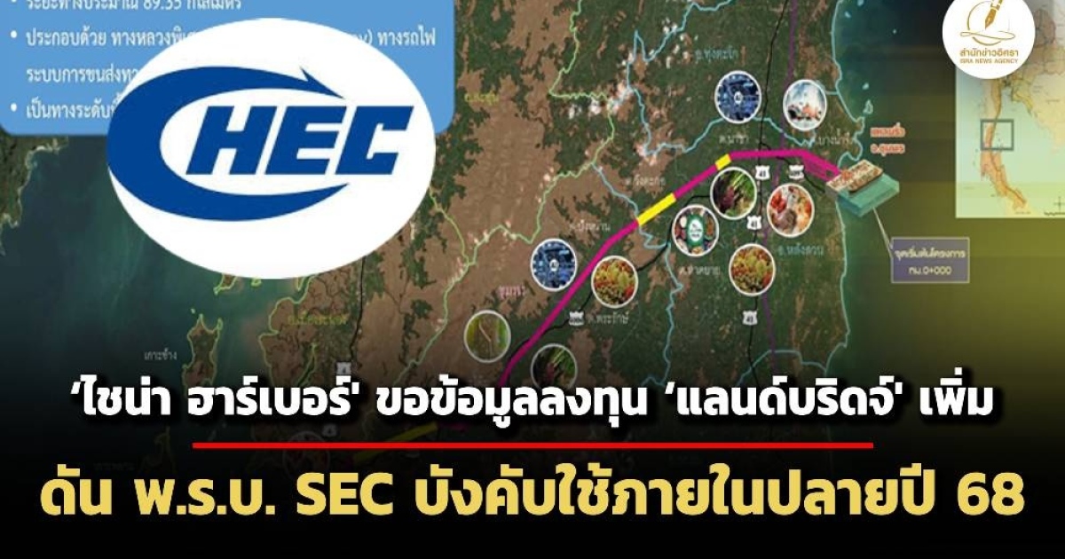 'แลนด์บริดจ์’ ยังเนื้อหอม ‘ไชน่าฮาร์เบอร์' ขอข้อมูลด้านการลงทุนเพิ่มหลังนายกฯบินกลับจากจีนช่วงต้น ก.พ.ที่ผ่านมา คอนเฟิร์มพร้อมลงทุนแน่นอน สนข.เตรียมแผนประมูลเฟสแรก 5 แสนล้านบาทปีหน้า ขณะที่การผลักดันร่างพ.ร.บ. SEC สภาพัฒน์-กฤษฎีกา เห็นพ้องเสนอ ครม. มอบอำนาจ สนข.เป็นคนทำ เผยเป้าหมายต้องการให้มีผลบังคับใช้ปลายปี 68