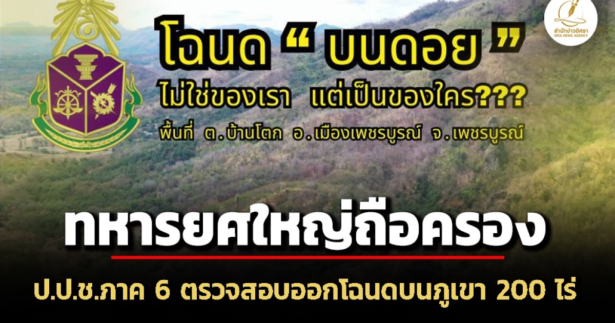 สำนักข่าวอิศรา (www.isranews.org) รายงานว่า วันที่ 1 มีนาคม 2568 เพจ ‘สำนักงาน ป.ป.ช. ภาค 6’ ประจำจังหวัดในเขตภาคเหนือตอนล่าง รับผิดชอบพื้นที่จังหวัดกำแพงเพชร ตาก นครสวรรค์ พิจิตร พิษณุโลก เพชรบูรณ์ สุโขทัย อุตรดิตถ์ และอุทัยธานี โพสต์เฟซบุ๊ก ระบุข้อความว่า ระหว่างวันที่ 26-27 กุมภาพันธ์ 2568 นายสุพจน์ ศรีงามเมือง รักษาราชการแทนรองเลขาธิการคณะกรรมการ ป.ป.ช. ภาค 6 ได้มอบหมายให้กลุ่มประสานการป้องกันการทุจริตภาค 6 และงานสืบสวนคดีทุจริตภาค 6 ลงพื้นที่ กรณีได้รับแจ้งจากประชาชนให้ตรวจสอบการออกเอกสารสิทธิ์ที่ดินในเขตป่าไม้ (ภูเขา) จำนวนหลายแปลง และมีบริเวณกว้างเกือบ 200 ไร่ พื้นที่ตำบลบ้านโตก อำเภอเมืองเพชรบูรณ์ จังหวัดเพชรบูรณ์ ถือครองโดยนายทหารยศใหญ่นอกราชการ