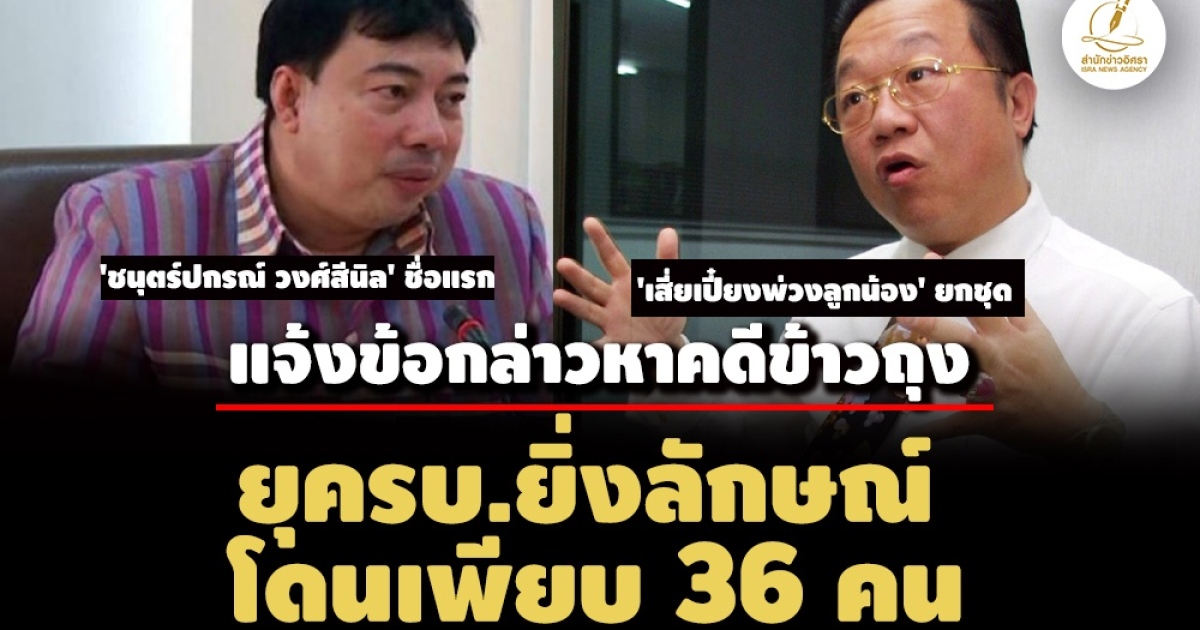 ป.ป.ช.ไต่สวนคดีทุจริตข้าวถุง สมัยรัฐบาล 'ยิ่งลักษณ์ ชินวัตร' ล่าสุดแจ้งข้อกล่าวหา 'ชนุตร์ปกรณ์ วงศ์สีนิล' อดีตผอ.คลังสินค้า อคส.กับพวกรวม 36 ราย มีชื่อ 'อภิชาติ จันทร์สกุลพร' หรือ 'เสี่ยเปี๋ยง' พร้อมลูกน้องทีมงาน บ.สยามอินดิก้า คดีทุจริตระบายข้าวจีทูจีครบชุด ก่อนสรุปสำนวนไต่สวนเสนอ คกก.ชุดใหญ่ พิจารณาผลตามขั้นตอนกม. - ยังเป็นผู้บริสุทธิ์อยู่