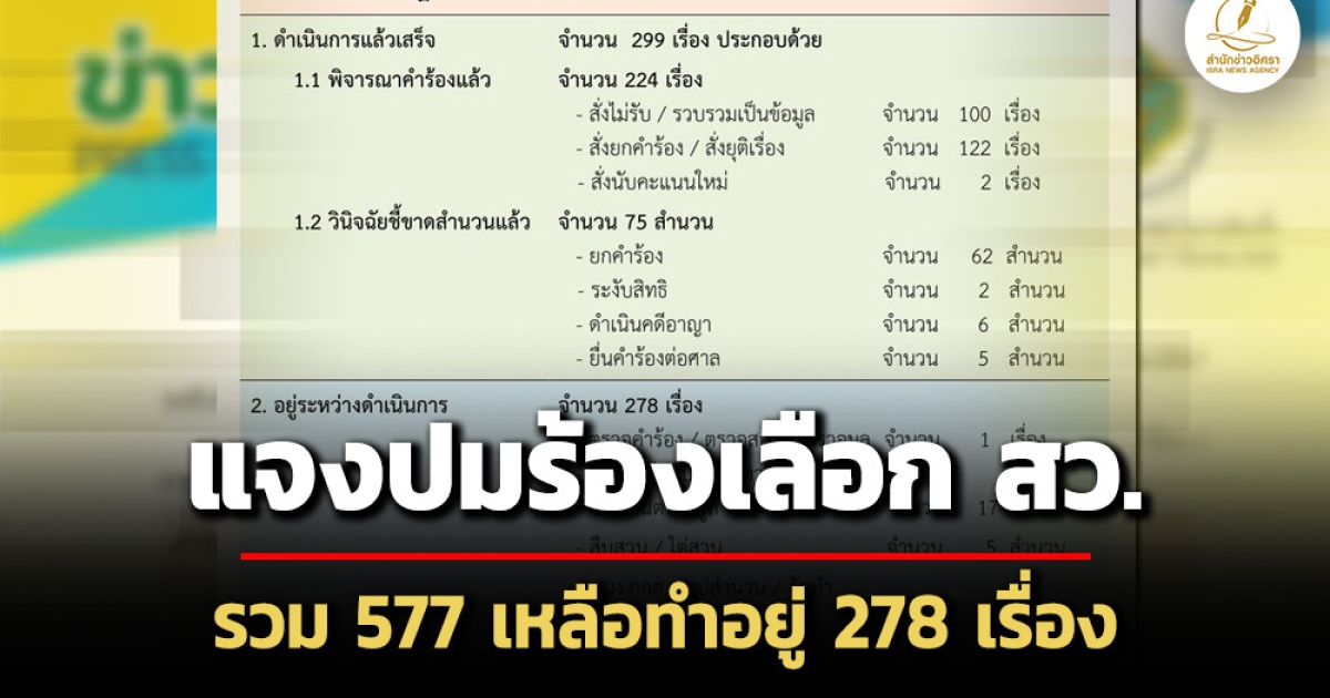 กกต.แจงขั้นตอนพิจารณา-สำนวนร้องเลือก สว. 577 เรื่อง พิจารณาเสร็จแล้ว 224 เรื่อง ยื่นศาลแล้ว 5 สำนวน ระงับสิทธิ 2 สำนวน สั่งอาญา 6 สำนวน เหลือดำเนินการอีก 278 เรื่อง