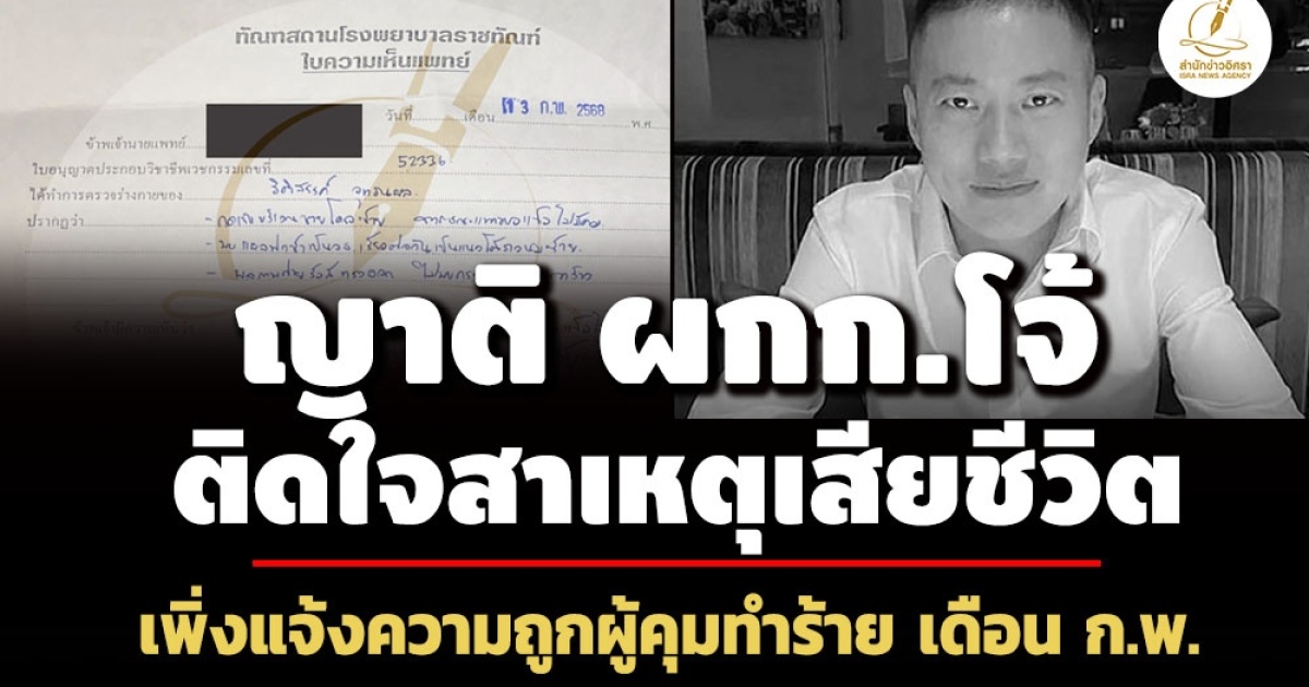 เผยข้อมูลฝั่งญาติ 'พ.ต.อ. ธิติสรรค์ อุทธนผล' หรือ 'ผู้กำกับโจ้' ยังติดใจสาเหตุเสียชีวิตผูกคอตายในห้องขัง เพราะก่อนหน้านี้เคยมีเรื่องทะเลาะเบาะแว้งผู้คุม-นักโทษ ถูกทำร้ายร่างกาย ช่วงเดือน ก.พ. ที่ผ่านมา มอบอำนาจให้ทนายความไปร้องทุกข์กล่าวโทษ มีใบรับรองแพทย์ยืนยัน - แถมแม่ยื่นเรื่องร้องเรียนให้อธิบดีราชทัณฑ์ ให้สอบสวน พร้อมขอย้ายตัวไปคุมขังในที่ปลอดภัยด้วย