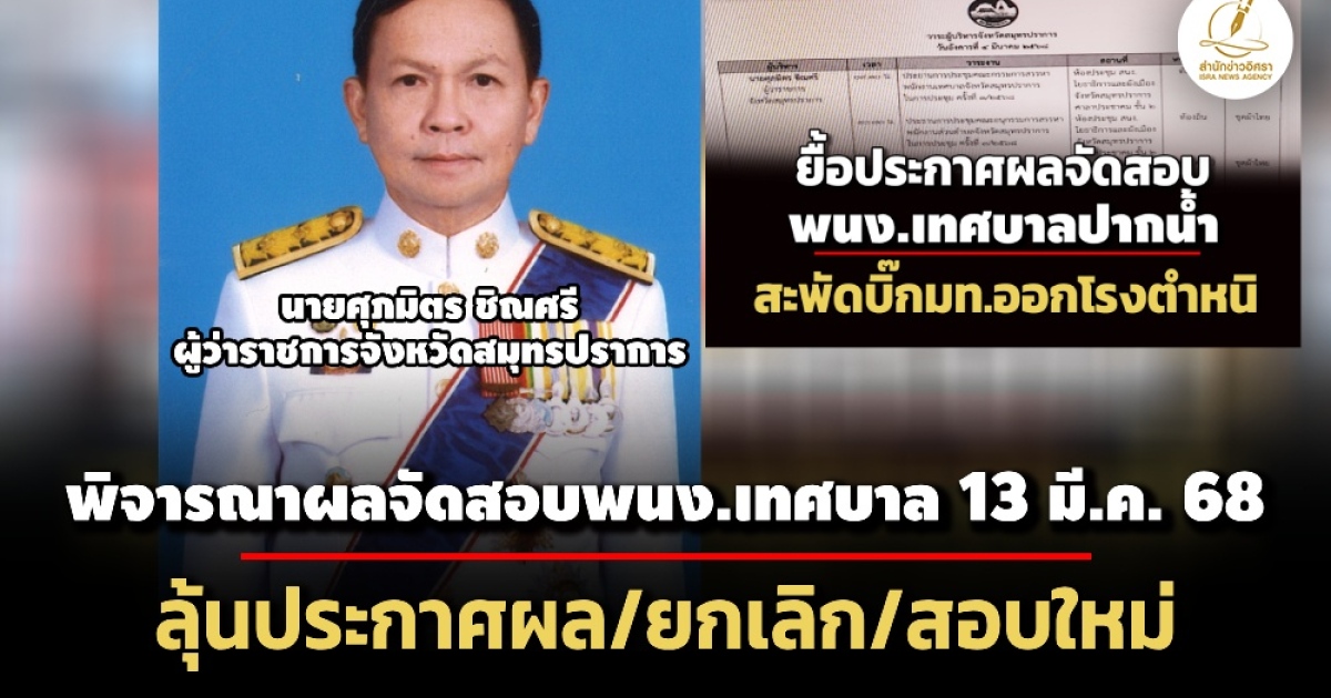 จับตาที่ประชุมผู้ว่าฯ ปากน้ำ พิจารณาผลจัดสอบพนง.เทศบาล 13 มี.ค. 68 นี้ ลุ้นจะประกาศผล/ยกเลิก/สอบใหม่ ผู้ว่าฯสมุทรปราการ แจงสาเหตุที่ยังไม่ประกาศเพราะข้อสอบมีข้อผิดพลาด ยังหาข้อสรุปไม่ได้