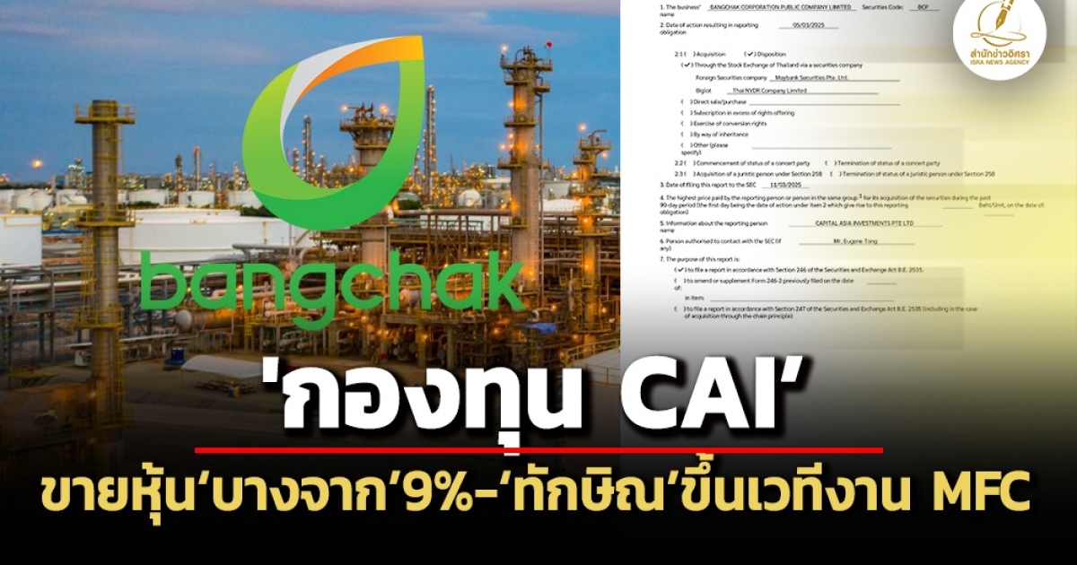 ‘กองทุน CAI’ เทขาย ‘Big Lot’ หุ้น ‘บางจาก คอร์ปอเรชั่น’ 9% คงเหลือถือหุ้น 4.86% ขณะที่ ‘ทักษิณ’ ขึ้นเวทีงานครบรอบ 50 ปี ‘บมจ.MFC’ หลัง 'OPUS-CHARTERED ISSUANCES S.A.' เข้าถือหุ้นใหญ่