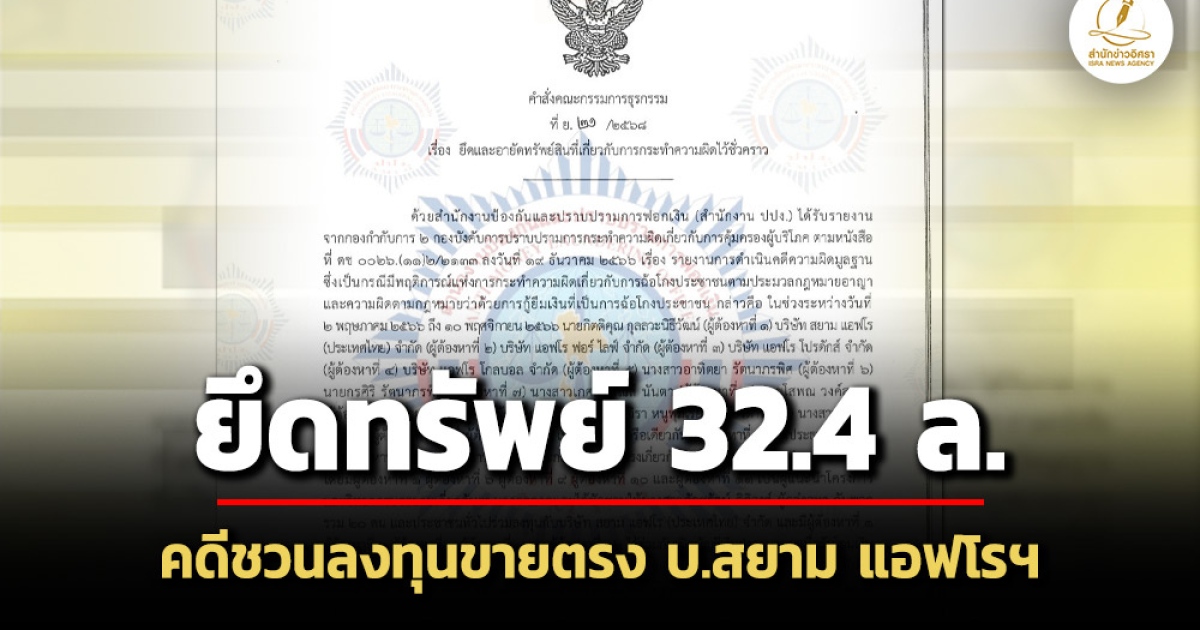 ปปง.ยึดอายัดทรัพย์ คดี บริษัท สยาม แอฟโรฯ ‘กิตติคุณ กุลลวะนิธีวัฒน์’ กับพวก จำนวน 26 รายการ รวม 32.4 ล้าน ที่ดิน-ห้องชุด-เงินสด 5 บัญชี ฐานฉ้อโกง-ฟอกเงิน ชักชวนลงทุนธุรกิจขายตรงสินค้าสุขภาพผ่านแอปฯ