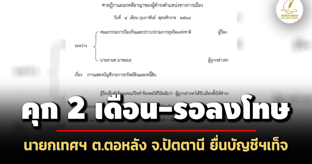 จำคุก 1 เดือน รอลงโทษ รองนายก อบต.หนองแรต จ.ปัตตานี ไม่ยื่นบัญชีฯ ป.ป.ช.