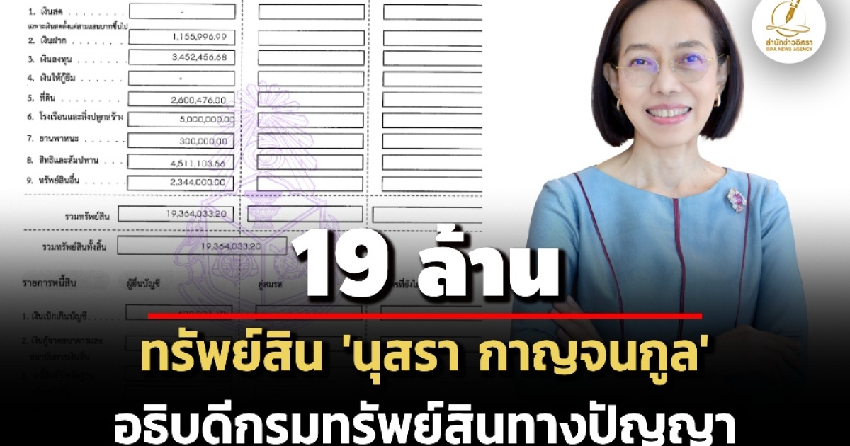 ป.ป.ช. เปิดทรัพย์สิน 'นุสรา กาญจนกูล' อธิบดีกรมทรัพย์สินทางปัญญา ทรัพย์สิน 19 ล. เงินลงทุน 3.4 ล. รายได้ 1.7 ล./ปี