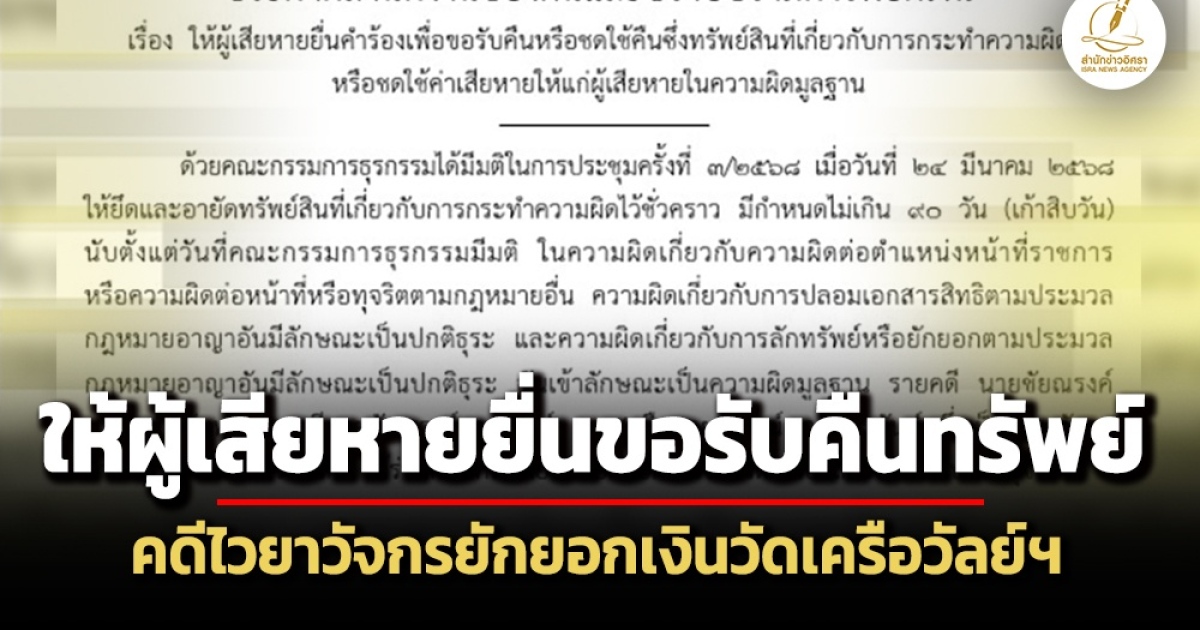 สำนักข่าวอิศรา www.isranews.org รายงานว่า วันที่ 1 เมษายน 2568 ราชกิจจานุเบกษา เผยแพร่ ประกาศสำนักงานป้องกันและปราบปรามการฟอกเงิน เรื่อง ให้ผู้เสียหายยื่นคำร้องเพื่อขอรับคืนหรือชดใช้คืนซึ่งทรัพย์สินที่เกี่ยวกับการกระทำความผิดหรือชดใช้ค่าเสียหายให้แก่ผู้เสียหายในความผิดมูลฐานราย นายชัยณรงค์ นพรัตน์ กับพวก ในความผิดเกี่ยวกับความผิดต่อตำแหน่งหน้าที่ราชการ หรือความผิดต่อหน้าที่หรือทุจริตตามกฎหมายอื่น ความผิดเกี่ยวกับการปลอมเอกสารสิทธิตามประมวลกฎหมายอาญาอันมีลักษณะเป็นปกติธุระ และความผิดเกี่ยวกับการลักทรัพย์หรือยักยอกตามประมวลกฎหมายอาญาอันมีลักษณะเป็นปกติธุระอันเข้าลักษณะเป็นความผิดมูลฐาน กรณีร่วมกันลักทรัพย์หรือยักยอกเงินของวัดเครือวัลย์วรวิหารไปโดยทุจริต ขอให้บุคคลผู้ได้รับความเสียหายยื่นคําร้องเพื่อขอรับคืนหรือชดใช้คืนซึ่งทรัพย์สินที่เกี่ยวกับการกระทำความผิดหรือชดใช้ค่าเสียหายให้แก่ผู้เสียหายในความผิดมูลฐานต่อพนักงานเจ้าหน้าที่ ณ สำนักงานป้องกันและปราบปรามการฟอกเงิน ภายใน 90 วัน ประกาศมีรายละเอียดดังนี้