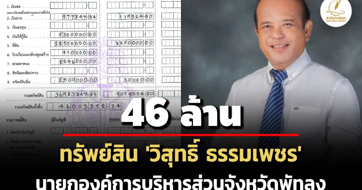 นายวิสุทธิ์ และนางทิพา ธรรมเพชร คู่สมรส แจ้งมีทรัพย์สินทั้งสิ้น 46,003,372 บาท ไร้หนี้สิน