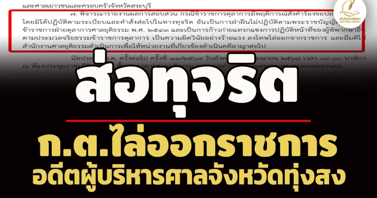 ก.ต.สั่งลงโทษไล่ออกราชการ อดีตผู้บริหารศาลจังหวัดทุ่งสง ออกคำสั่งทับคำสั่งผู้พิพากษาปล่อยตัวชั่วคราวผู้ต้องหา ผิดวินัยร้ายแรง ส่อไปในทางทุจริต สอบสวนพบมียอดเงินเข้าบัญชีผิดปกติ ถูกสั่งพักราชการไปหลายเดือนแล้ว ส่ง ป.ป.ช.ดำเนินคดีอาญาต่อ