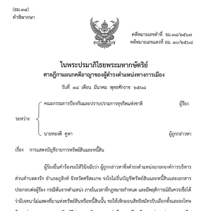 คำพิพากษาคดีหมายเลขดำที่ อม.38/2567คดีหมายเลขแดงที่ อม. 10/2568 ศาลฎีกาแผนกคดีอาญาของผู้ดำรงตำแหน่งทางการเมือง วันที่ 18 เดือน มีนาคม พุทธศักราช 2568 ระหว่าง คณะกรรมการป้องกันและปราบปรามการทุจริตแห่งชาติ ผู้ร้องนายทองดี คูหา ผู้ถูกกล่าวหา