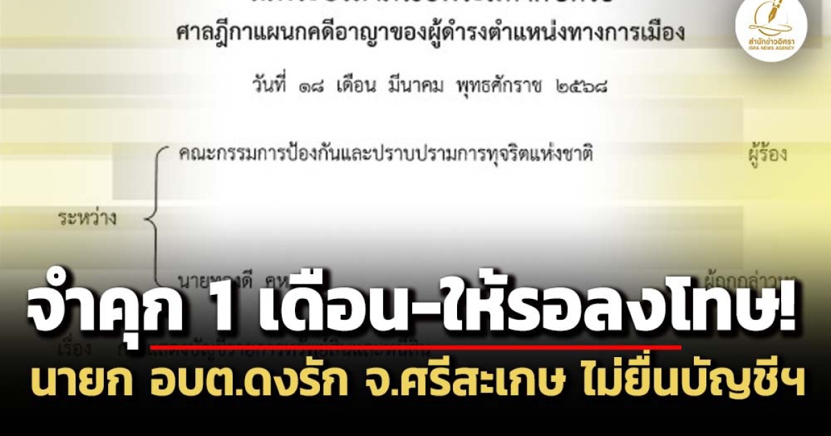 รองนายก อบต.หนองบัวใต้ หนองบัวลำภู ไม่ยื่นบัญชีฯ 2 ครั้ง จําคุก 2 เดือน ให้รอลงโทษ