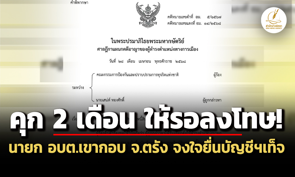 - ให้พ้นตำแหน่ง! รองนายก อบต.น้ำผุด จ.สตูล จงใจไม่ยื่นบัญชีฯ คุก 2 เดือน รอลงโทษ