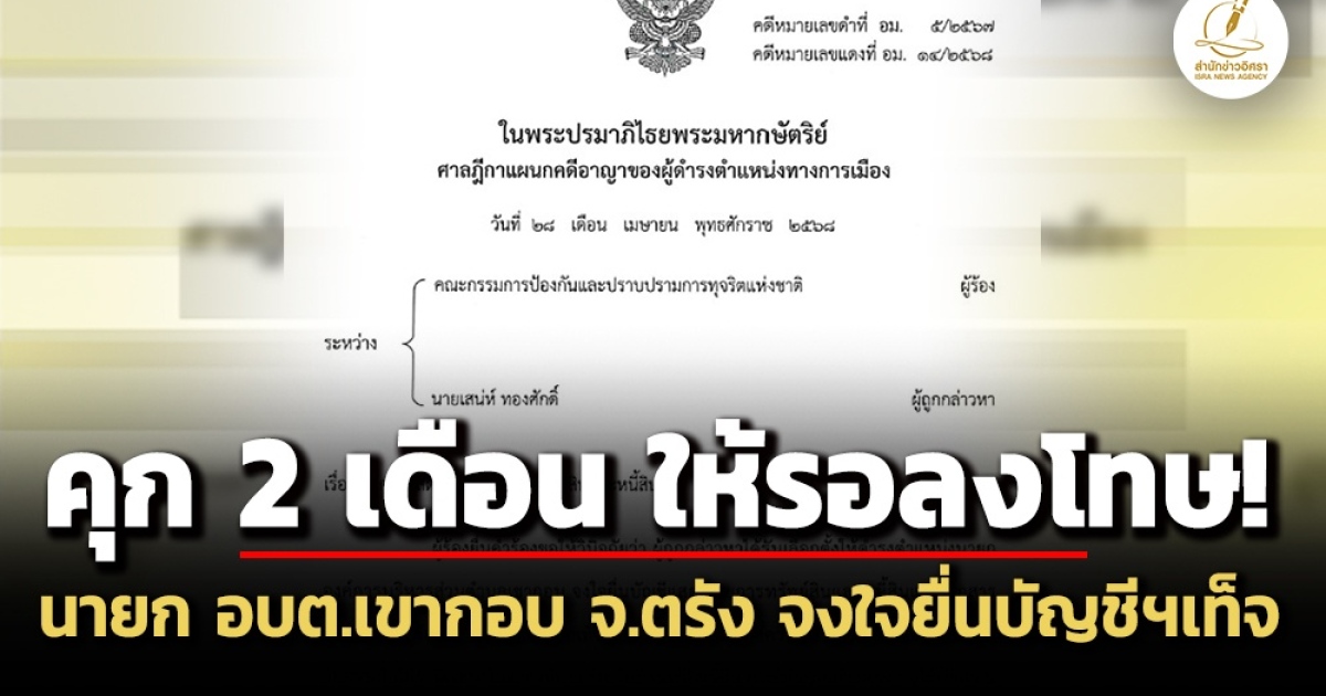 สำนักข่าวอิศรา (www.isranews.org) รายงานว่า เมื่อวันที่ 28 เมษายน 2568 ศาลฎีกาแผนกคดีอาญาของผู้ดำรงตำแหน่งทางการเมืองพิพากษาว่า นายเสน่ห์ ทองศักดิ์ นายกองค์การบริหารส่วนตําบลเขากอบ อ.ห้วยยอด จ.ตรัง ผู้ถูกกล่าวหา จงใจยื่นบัญชีแสดงรายการทรัพย์สินและหนี้สินและเอกสารประกอบต่อผู้ร้องด้วยข้อความอันเป็นเท็จ หรือปกปิดข้อเท็จจริงที่ควรแจ้งให้ทราบ และมีพฤติการณ์อันควรเชื่อได้ว่ามีเจตนาไม่แสดงที่มาแห่งทรัพย์สินหรือหนี้สิน กรณีพ้นจากตําแหน่งนายกองค์การบริหารส่วนตําบลเขากอบ ตามพระราชบัญญัติประกอบรัฐธรรมนูญว่าด้วยการป้องกันและปราบปรามการทุจริต พ.ศ. 2561 มาตรา 114 วรรคสอง (1) ให้เพิกถอนสิทธิสมัครรับเลือกตั้งของผู้ถูกกล่าวหาตลอดไป ตามพระราชบัญญัติประกอบรัฐธรรมนูญว่าด้วยการป้องกันและปราบปรามการทุจริต พ.ศ. 2561 มาตรา 81 ประกอบมาตรา 114 วรรคสาม กับมีความผิดตาม มาตรา 167 จําคุก 2 เดือน และปรับ 8,000 บาท ไม่ปรากฏว่าผู้ถูกกล่าวหาเคยได้รับโทษจําคุกมาก่อน โทษจําคุกจึงให้รอการลงโทษไว้มีกําหนด 1 ปี