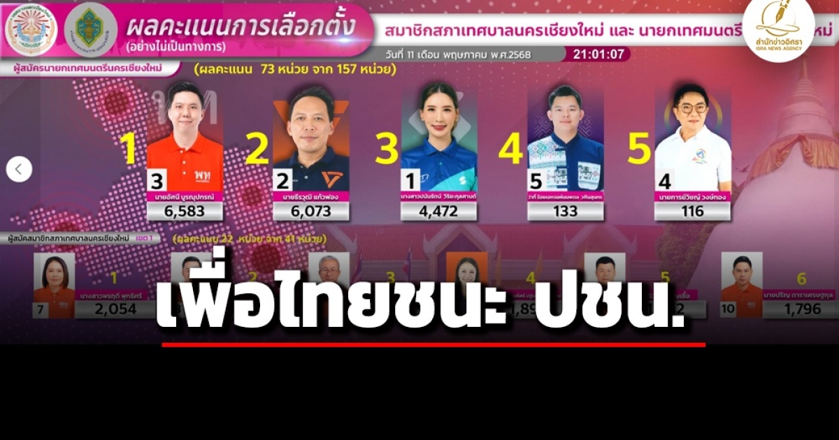 สรุปผลการเลือกตั้ง นายกเทศฯทั่วประเทศ กกต.เผยภาพรวมเป็นไปอย่างเรียบร้อย ฉีกบัตรแค่ 6 ราย จ.ตรัง นพ.รักษ์ คะแนนนำลิ่ว -นครเชียงใหม่ 'อัศนี' ตัวแทนพรรคเพื่อไทยคะแนนทิ้งห่าง ปชน. เจ้าตัวประกาศชัยชนะพร้อมขอบคุณทักษิณ -นครสวรรค์ แชมป์เก่า 'จิตตเกษมณ์ นิโรจน์ธนรัฐ' ชนะตัวแทนพรรค ปชน. -นครนนทบุรี 'สมนึก ธนเดชากุล' เอาชนะ 'ธีรวงศ์ สรรค์พิพัฒน์' ตัวแทน พรรค ปชน. กลายเป็นนายกเทศฯติดต่อกัน 45 ปี ด้าน 'เท้ง' แถลงผล ปชน.ชนะแล้ว 10 เก้าอี้ เทศบาลเมือง 3 , เทศบาลตำบล 7
