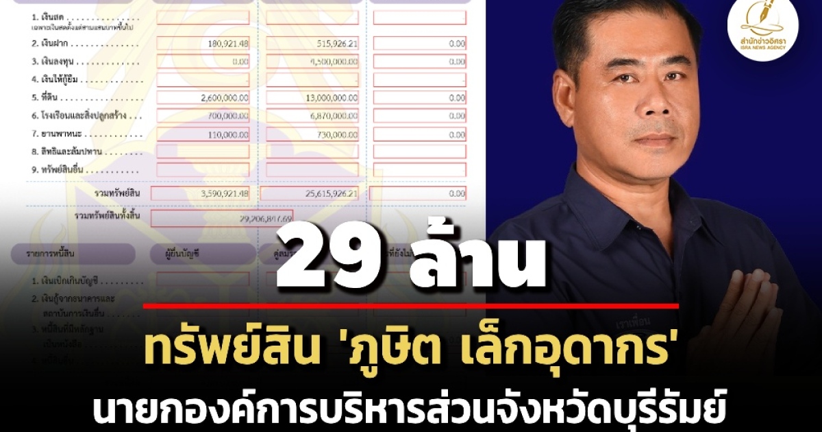 ป.ป.ช. เปิดทรัพย์สินองค์กรปกครองส่วนท้องถิ่น 'ภูษิต เล็กอุดากร' นายกอบจ.บุรีรัมย์ ทรัพย์สิน 29 ล. รายได้ 8.6 แสน/ปี-ลดลงจากปี 64 3.2 ล.