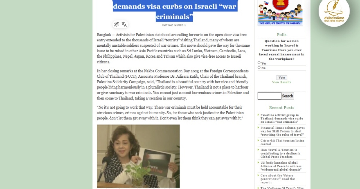 นักเคลื่อนไหวปาเลสไตน์เรียกร้องรัฐบาลไทยจำกัดวีซ่านักท่องเที่ยวอิสราเอล ชี้หลายคนเป็นอดีตทหารมีส่วนในอาชญากรรมสงคราม มีพฤติกรรมก้าวร้าว เผชิญกับภาวะ PTSD
