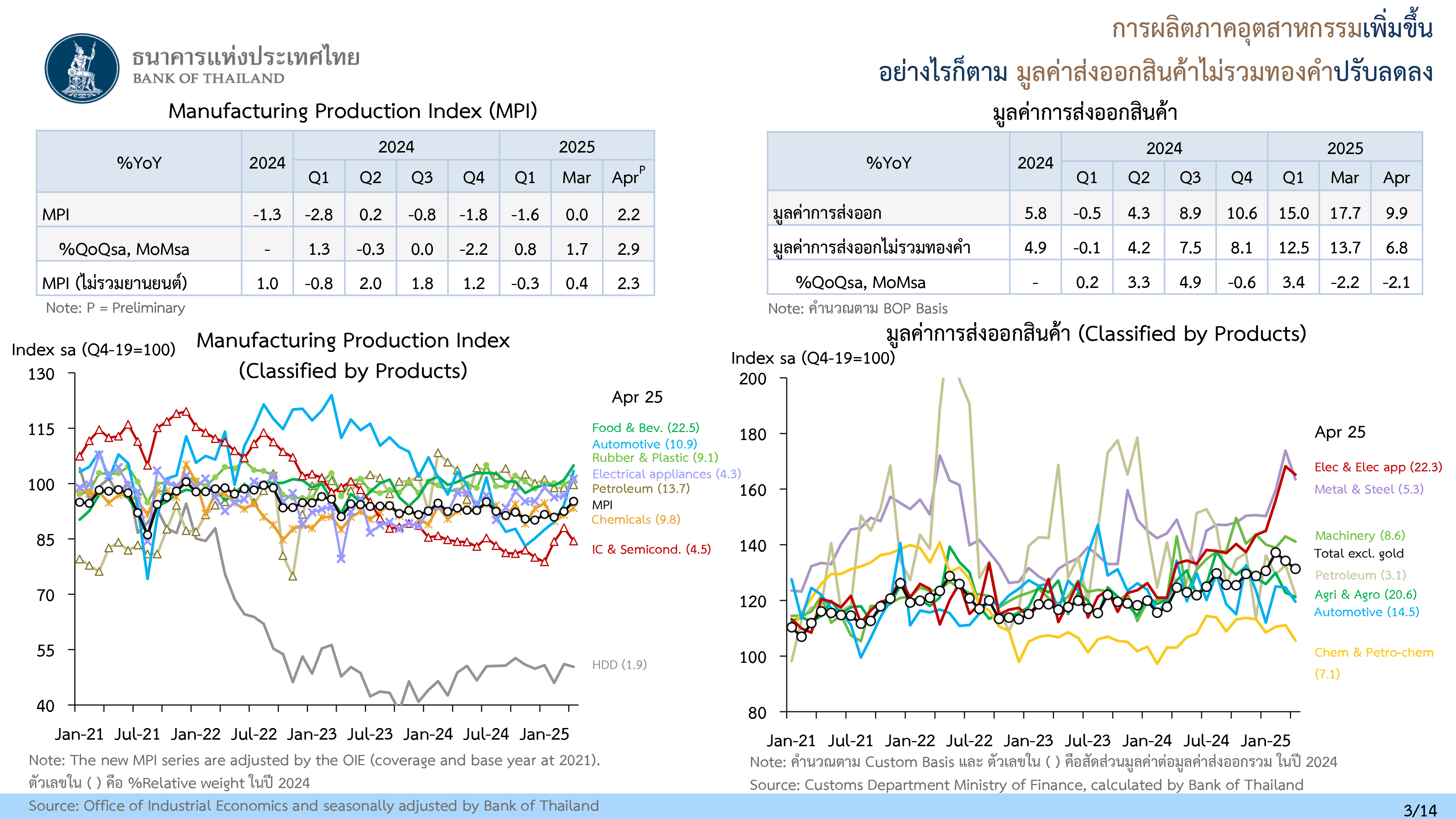 การส่งออกสินค้า มูลค่าการส่งออกสินค้าไม่รวมทองคำที่ขจัดปัจจัยฤดูกาลแล้วลดลงจากเดือนก่อน ตามการส่งออก (1) สินค้าเกษตร ตามการส่งออกยางธรรมชาติไปจีนที่ชะลอลงหลังเร่งไปมากในช่วงก่อนหน้า และการส่งออกทุเรียนไปจีน (2) ยานยนต์ ตามการส่งออกรถกระบะไปออสเตรเลียและอาเซียน ชิ้นส่วนยานยนต์ไปสหรัฐฯ และรถยนต์นั่งไปตะวันออกกลางและอาเซียน และ