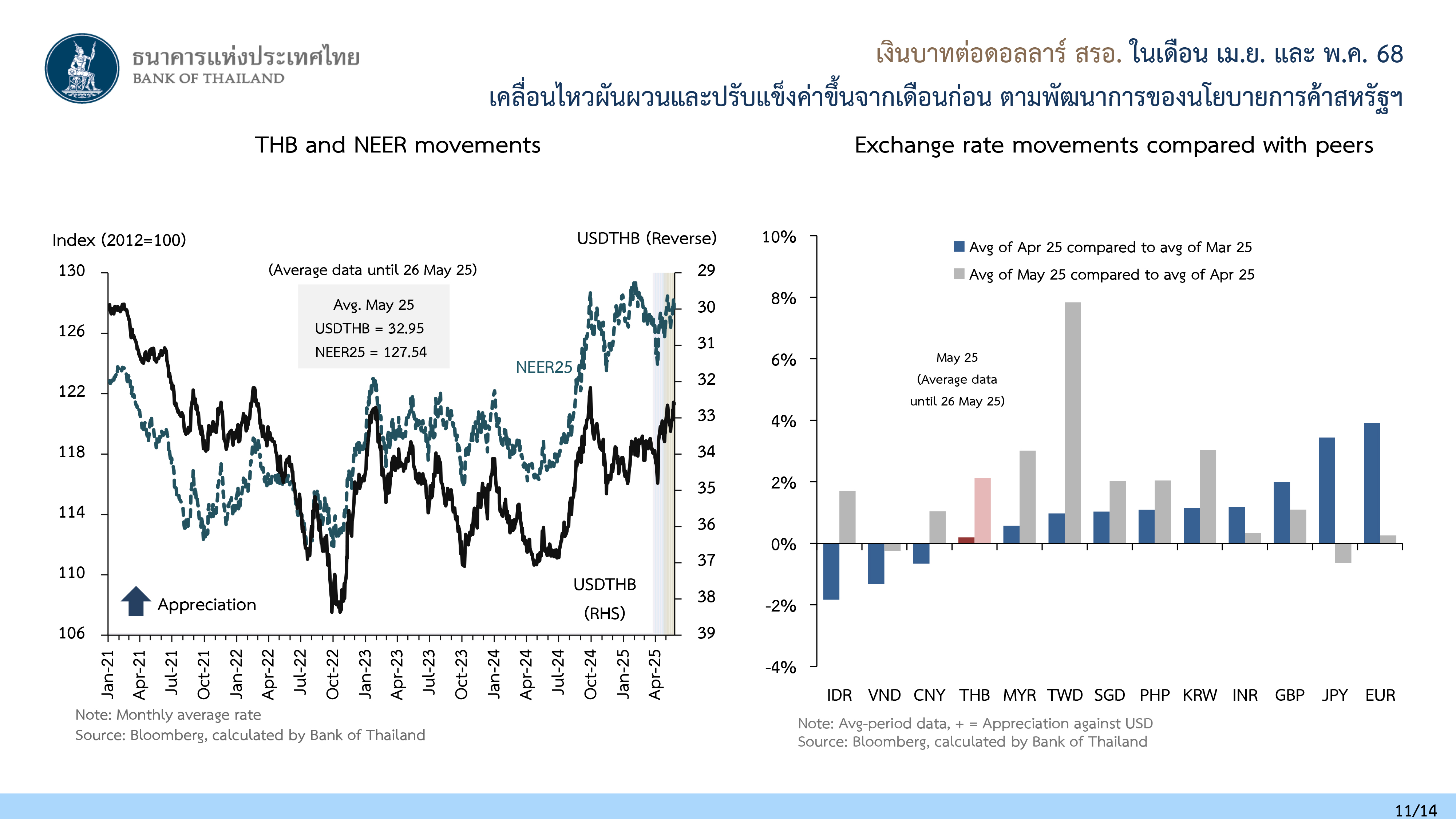 อัตราแลกเปลี่ยนเงินบาทเทียบกับดอลลาร์ สรอ. เดือนเมษายน ถึง 26 พฤษภาคม 2568 เงินบาทเคลื่อนไหวผันผวนและเฉลี่ยปรับแข็งค่าขึ้นจากเดือนมีนาคม จากการอ่อนค่าของเงินดอลลาร์ สรอ. ตามความไม่แน่นอนของนโยบายการค้าของสหรัฐฯ และความกังวลของตลาดต่อแนวโน้มเศรษฐกิจของสหรัฐฯ ด้านดัชนีค่าเงินบาท (NEER) ปรับลดลงในเดือนเมษายน เนื่องจากนักลงทุนมีความกังวลต่อการที่ไทยถูกจัดอยู่ในกลุ่มที่ได้รับผลกระทบจากนโยบายการค้าของสหรัฐฯ สูง ขณะที่ในเดือนพฤษภาคมปรับแข็งค่าขึ้น เนื่องจากตลาดคลายความกังวลลงบ้างหลังสหรัฐฯ มีความคืบหน้าในการเจรจาทางการค้ากับประเทศคู่ค้าสำคัญ