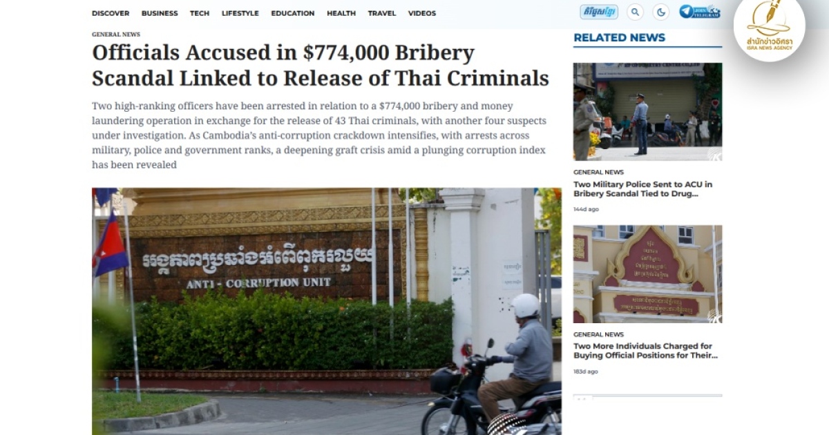 สำนักข่าวอิศรา (www.isranews.org) รายงานข่าวว่าเมื่อวันที่ 26 พ.ค.ที่ผ่านมา นายพลัง โสพาล โฆษกศาลกรุงพนมเปญได้ให้สัมภาษณ์ยืนยันว่าเจ้าหน้าที่ได้มีการจับกุมนายฟอน เวสนา รองสารวัตรตำรวจเขตบาเวล จังหวัดพระตะบอง และนายตาง สัมนัง รองอธิบดีกรมวัสดุเทคนิค กระทรวงกลาโหม ในข้อหาว่าทั้งสองมีส่วนเกี่ยวข้องกับคดีสินบนเรียกเงินจำนวนหลายแสนดอลลาร์สหรัฐฯ แลกกับการปล่อยตัวอาชญากรไทยจำนวน 43 คน