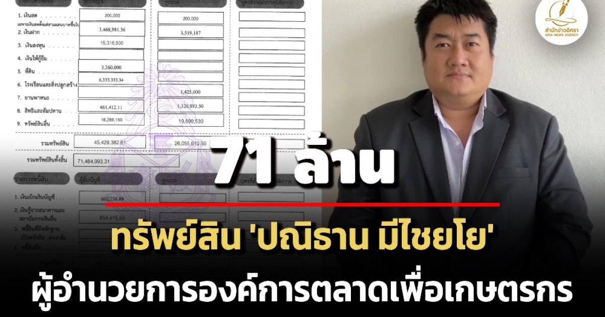 ป.ป.ช. เปิดทรัพย์สินผู้ดำรงตำแหน่งระดับสูง 'ปณิธาน มีไชยโย' ผู้อำนวยการองค์การตลาดเพื่อเกษตรกร ทรัพย์สิน 71 ล.เงินลงทุน 15 ล. รายได้ 3.4 ล./ปี