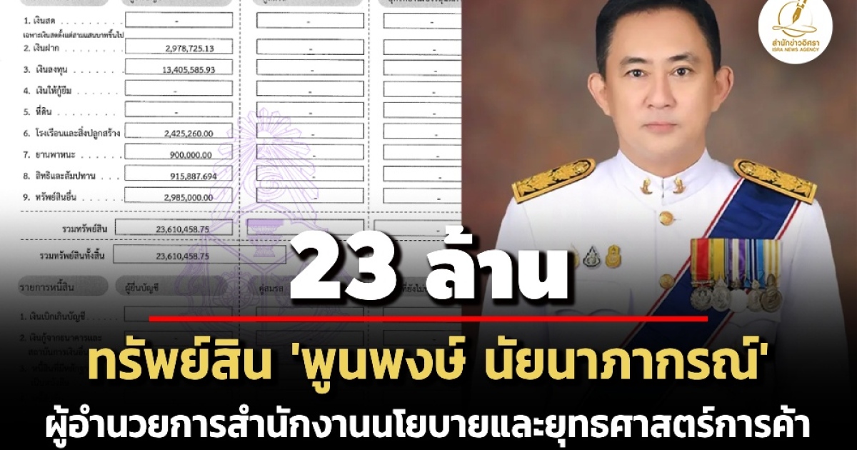 ป.ป.ช. เปิดทรัพย์สินผู้ดำรงตำแหน่งระดับสูง 'พูนพงษ์ นัยนาภากรณ์' ผู้อำนวยการสำนักงานนโยบายและยุทธศาสตร์การค้า ทรัพย์สิน 23 ล. เงินลงทุน 13 ล. รายได้ 1.8 ล./ปี ไร้หนี้สิน