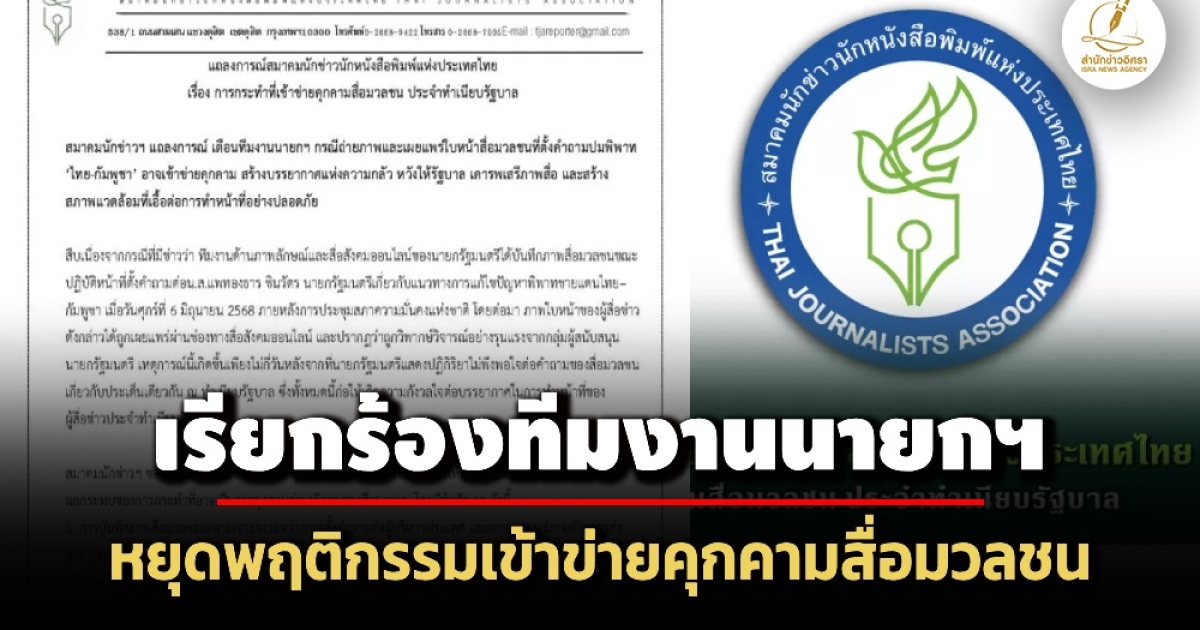 สำนักข่าวอิศรา (www.isranews.org) รายงานว่า เมื่อวันที่ 11 มิ.ย. 2568 สมาคมนักข่าวนักหนังสือพิมพ์แห่งประเทศไทย เผยแพร่แถลงการณ์เรียกร้องให้ทีมงานนายกรัฐมนตรีและผู้ที่เกี่ยวข้องหยุดพฤติกรรมที่อาจถูกตีความว่าเป็นการคุกคามสื่อมวลชน จากกรณีที่ทีมงานของนายกรัฐมนตรีถ่ายภาพผู้สื่อข่าวที่ตั้งคำถามต่อน.ส.แพทองธาร ชินวัตร นายกรัฐมนตรี เกี่ยวกับแนวทางการแก้ไขปัญหาพิพาทชายแดนไทย–กัมพูชา เมื่อวันที่ 6 มิ.ย. 2568 แล้วภาพของผู้สื่อข่าวถูกเผยแพร่ผ่านช่องทางสื่อสังคมออนไลน์ และถูกวิพากษ์วิจารณ์อย่างรุนแรงจากกลุ่มผู้สนับสนุนนายกรัฐมนตรี
