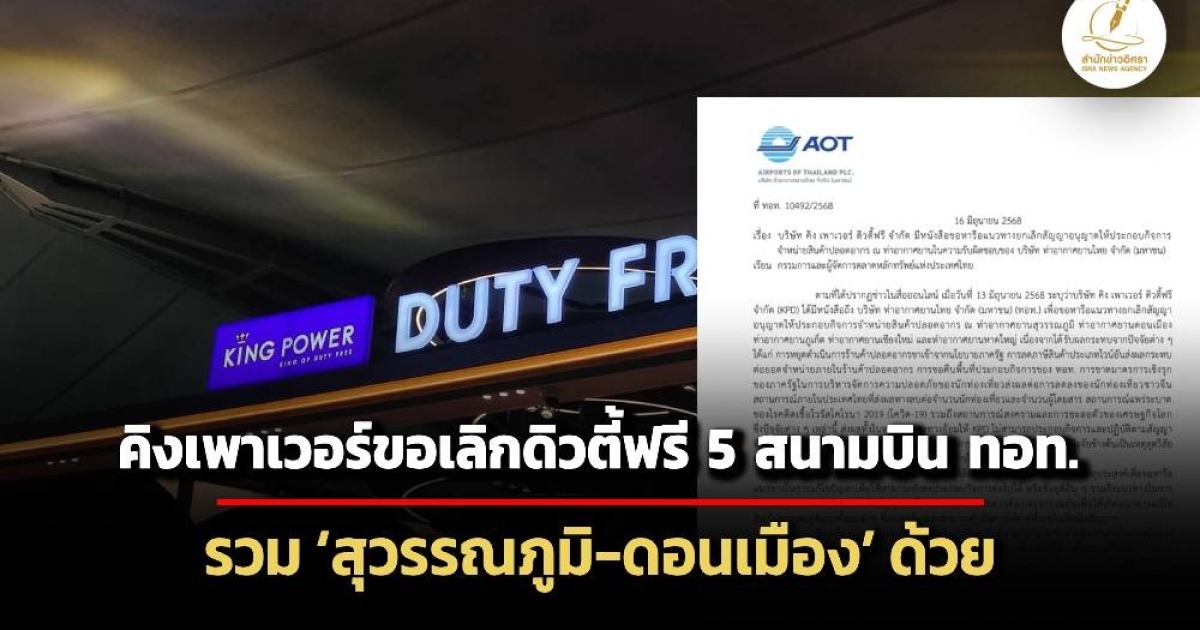 สำนักข่าวอิศรา (www.isranews.org) รายงานว่า วันที่ 16 มิถุนายน 2568 บมจ.ท่าอากาศยานไทย (ทอท.) มีหนังสือแจ้งตลาดหลักทรัพย์แห่งประเทศไทย (SET) ความว่า ตามที่ได้ปรากฏข่าวในสื่อออนไลน์ เมื่อวันที่ 13 มิ.ย. 68 ระบุว่าบริษัท คิง เพาเวอร์ ดิวตี้ฟรี จำกัด (KPD) ได้มีหนังสือถึง ทอท. เพื่อขอหารือแนวทางยกเลิกสัญญาอนุญาตให้ประกอบกิจการจำหน่ายสินค้าปลอดอากร ณ ท่าอากาศยานสุวรรณภูมิ ท่าอากาศยานดอนเมือง ท่าอากาศยานภูเก็ต ท่าอากาศยานเชียงใหม่ และท่าอากาศยานหาดใหญ่ เนื่องจากได้รับผลกระทบจากปัจจัยต่าง ๆ ได้แก่ การหยุดดำเนินการร้านค้าปลอดอากรขาเข้าจากนโยบายภาครัฐ การลดภาษีสินค้าประเภทไวน์อันส่งผลกระทบต่อยอดจำหน่ายภายในร้านค้าปลอดอากร การขอคืนพื้นที่ประกอบกิจการของ ทอท. การขาดมาตรการเชิงรุกของภาครัฐในการบริหารจัดการความปลอดภัยของนักท่องเที่ยวส่งผลต่อการลดลงของนักท่องเที่ยวชาวจีน สถานการณ์ภายในประเทศไทยที่ส่งผลทางลบต่อจำนวนนักท่องเที่ยวและจำนวนผู้โดยสาร สถานการณ์แพร่ระบาดของโรคติดเชื้อไวรัสโคโรนา 2019 (โควิด-19) รวมถึงสถานการณ์สงครามและการชะลอตัวของเศรษฐกิจโลก